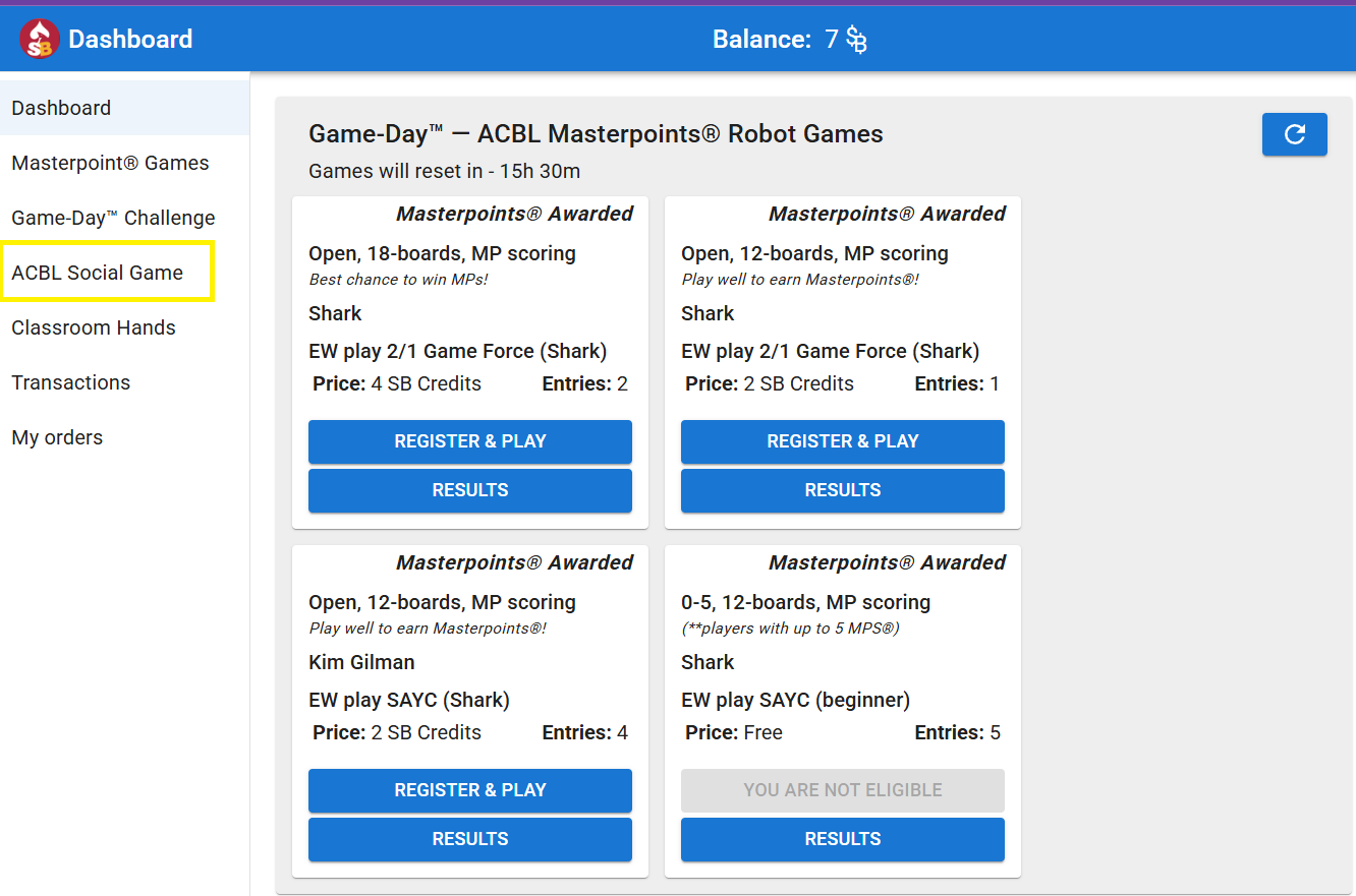 If you wind up on the main Dashboard page, go to the “ACBL Social Game” on the left-side menu.