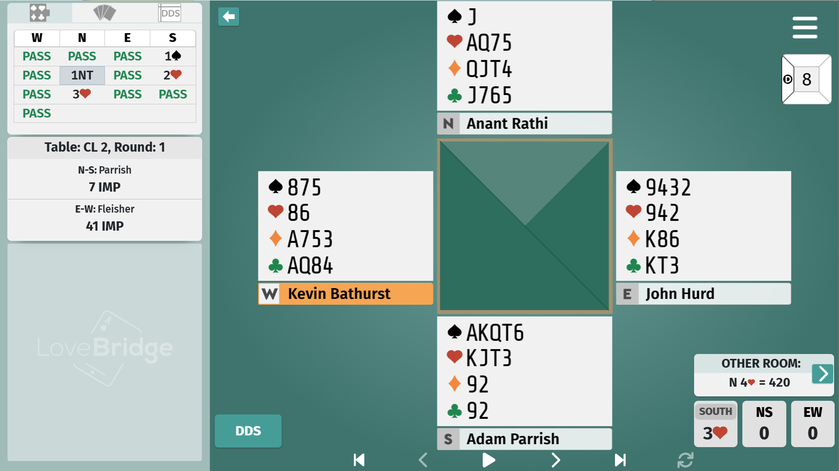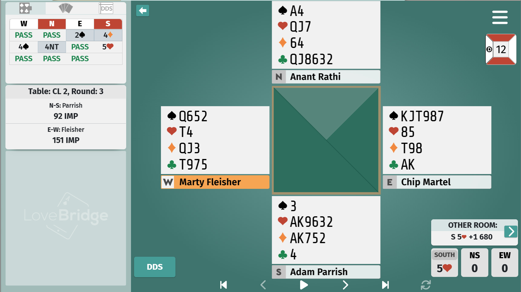 Most of the tables duplicated our first two rounds, but almost everyone raised to game with Anant’s hand. Which surprised me. Maybe it’s my matchpoint mind. Obviously the hearts are nice, and the jack of spades could be a really great card (as it is). But the minor-suit cards could be useless (as they are).
