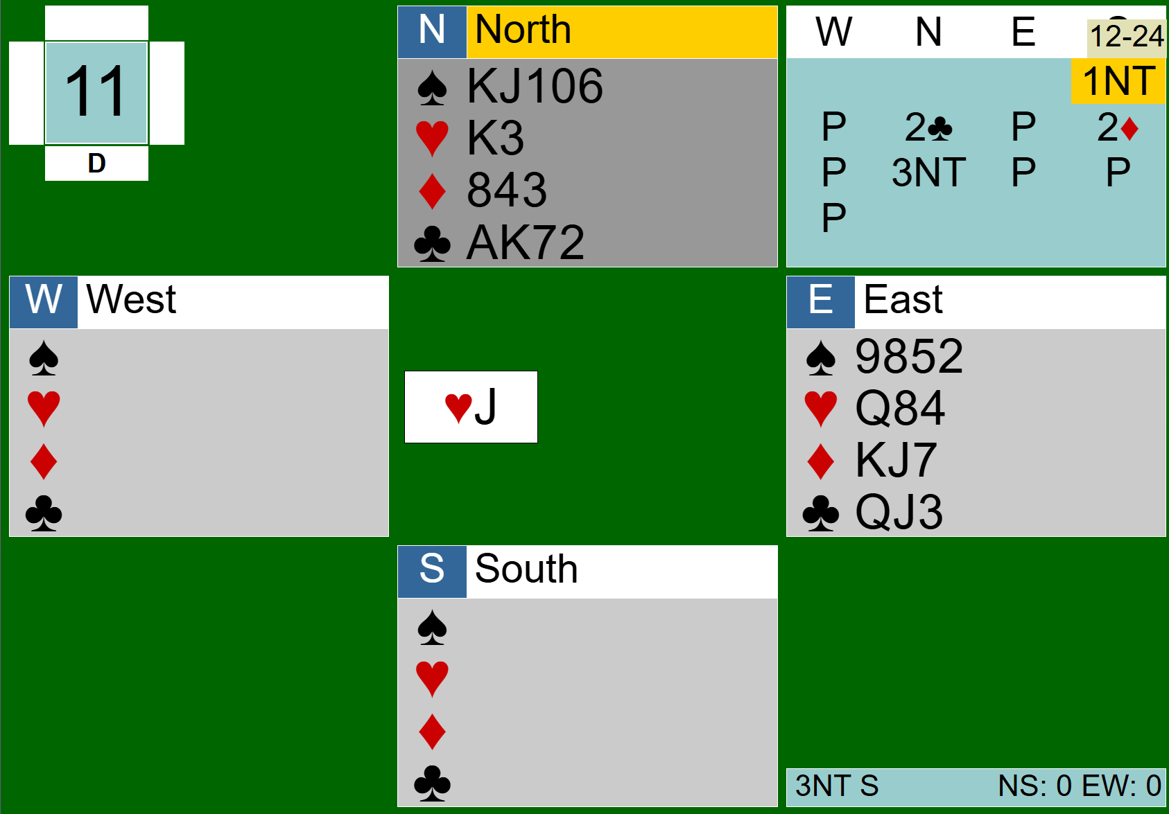 “Your partner leads the knave of hearts against South’s 3NT contract. The three is played from dummy, you encourage with the eight and South plays the two. West continues with the nine of hearts, and you drop your queen under dummy’s king. The three of diamonds is now led from dummy. How do you plan the defence?”