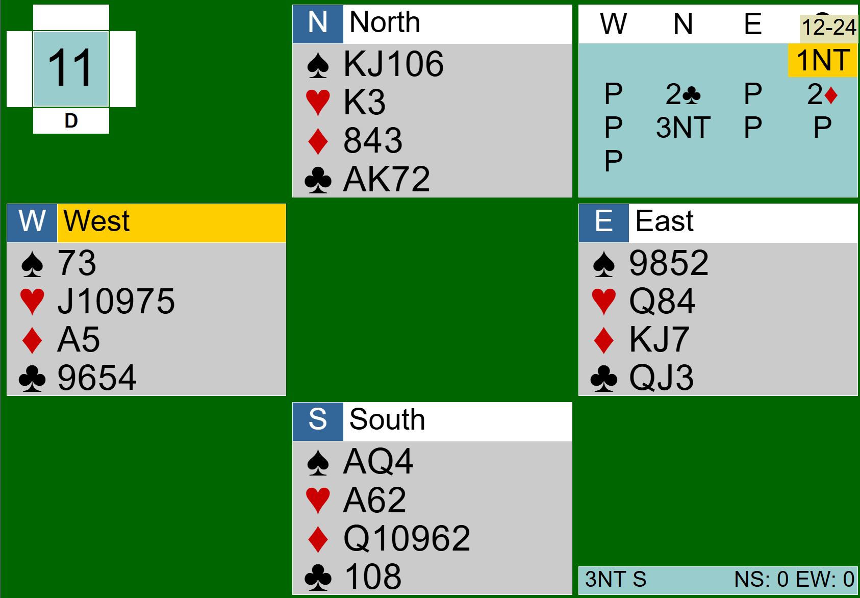 Greg has been out of town, so our practice has been limited to Cuebids. I have been doing some robot tournaments and VuGraph review. My morning routine is going well, and I’m walking and meditating every day.